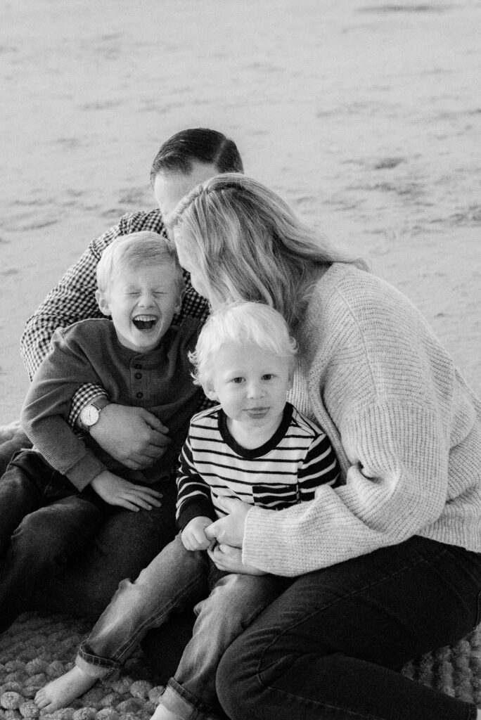 For their photo session styling they chose to go with a casual vibe. The striped pattern on their youngest son’s shirt gave their whole crew a nautical look which paired nicely with the winter beach surroundings. We also added a fluffy blanket prop for the boys to curl up in.